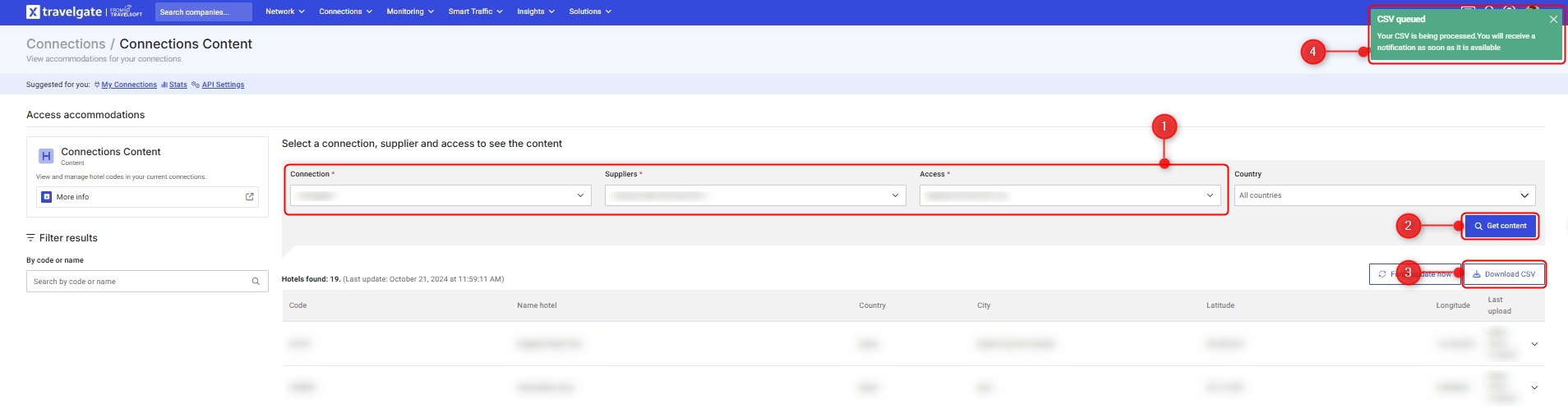 Filter by Connection > Supplier > Access, and click the "Get content" button to retrieve the corresponding portfolio. You can also filter by Country, Hotel Code, or Hotel Name using the "Filter results" panel on the left side of the screen.