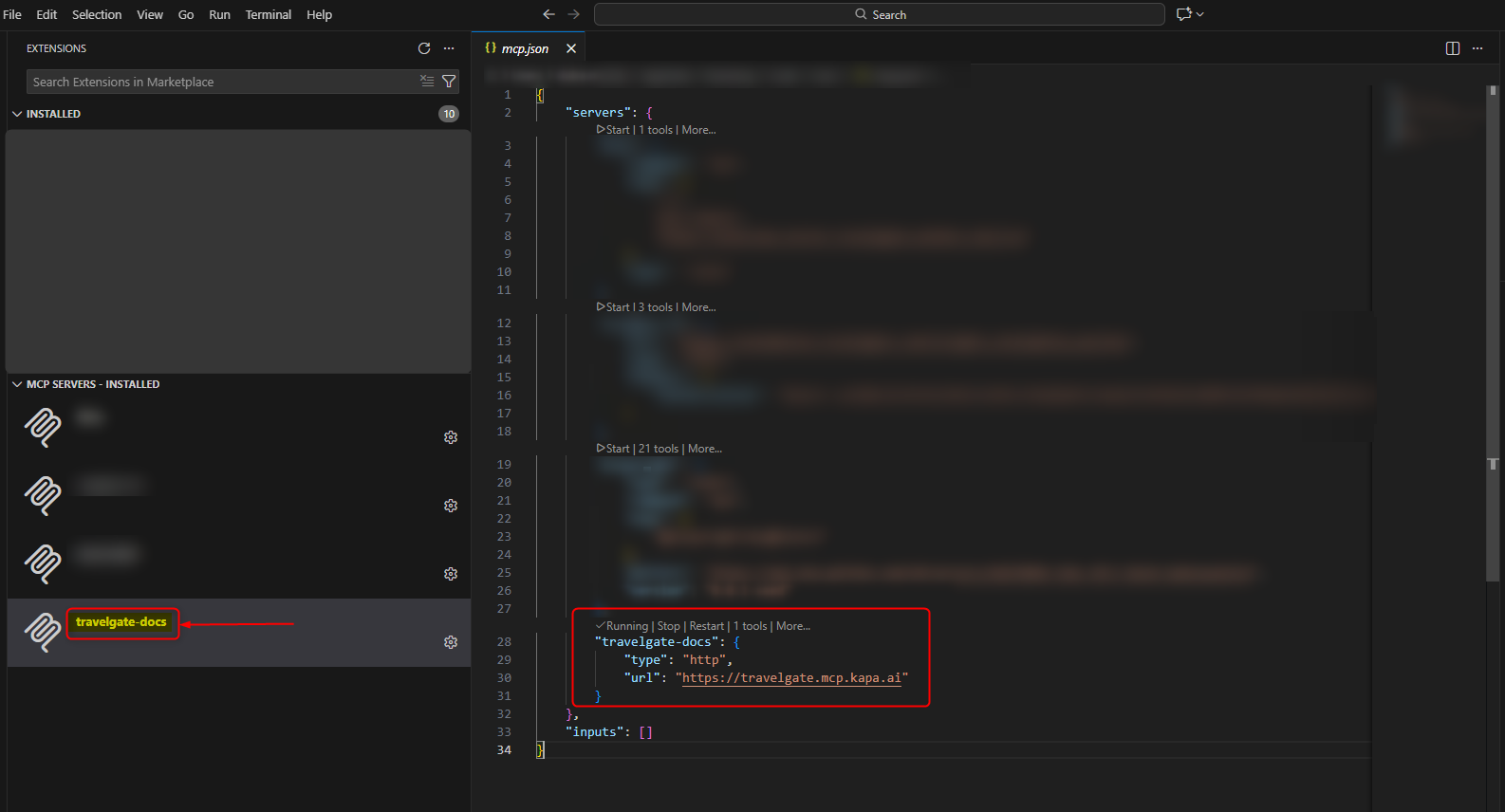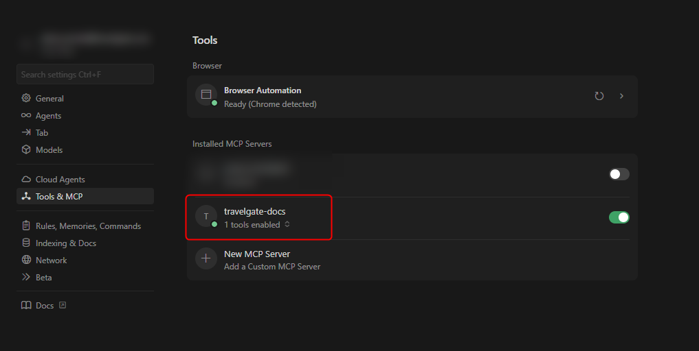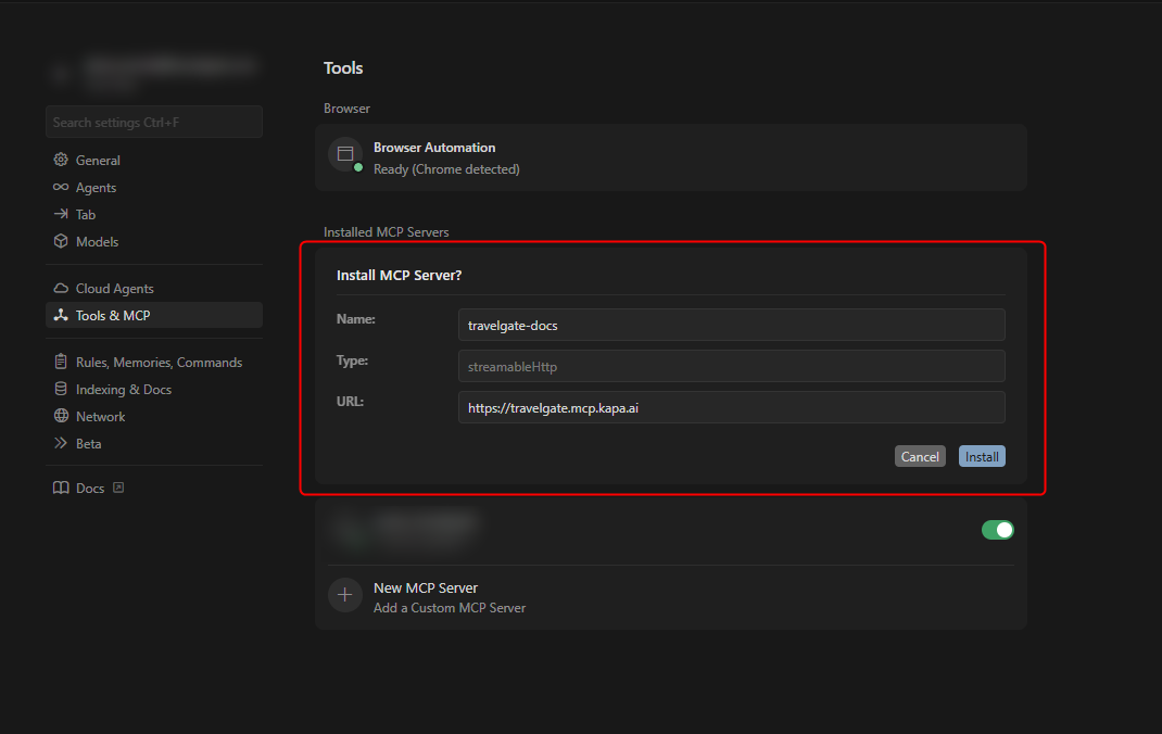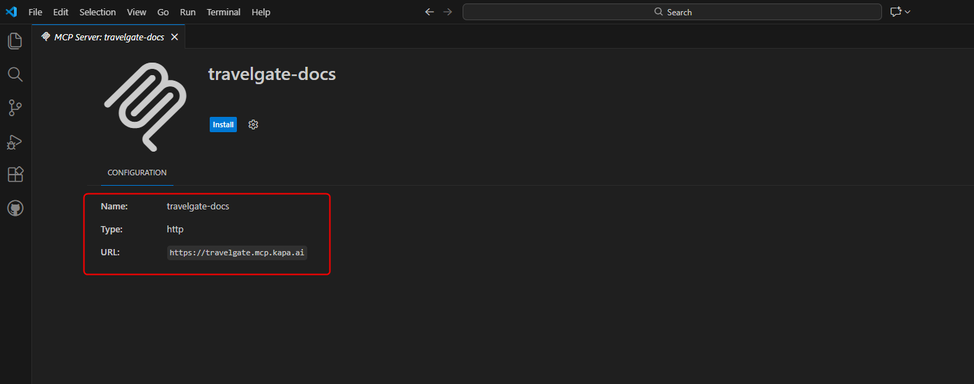 To access Travelgate’s Documentation MCP server (https://travelgate.mcp.kapa.ai), follow these steps: