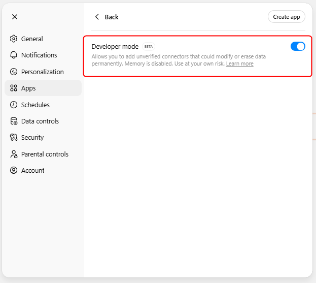 A new Create app button will appear in the top-right corner. Alternatively, return to the Apps main page and click Create app next to Advanced Settings.